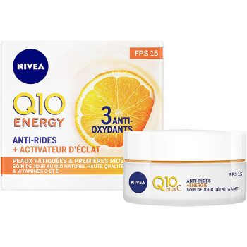 Le Soin de Jour Anti-Rides Q10 Energy FPS15 active l’éclat de votre peau et réduit les rides et les ridules. Formulé pour les besoins des peaux fatiguées et ternes. Ce soin Anti-Rides au Q10 naturel haute qualité, 100% identique à celui de la peau et Vitamines C et E soutient la capacité de votre peau à améliorer son métabolisme énergétique (testé in vitro) et aide votre peau à lutter efficacement contre les radicaux libres. Résultat : Les rides et ridules sont réduites, votre peau est hydratée pendant 24h et votre teint est éclatant de santé. Complétez votre routine beauté avec le Soin de Nuit Q10 Energy.